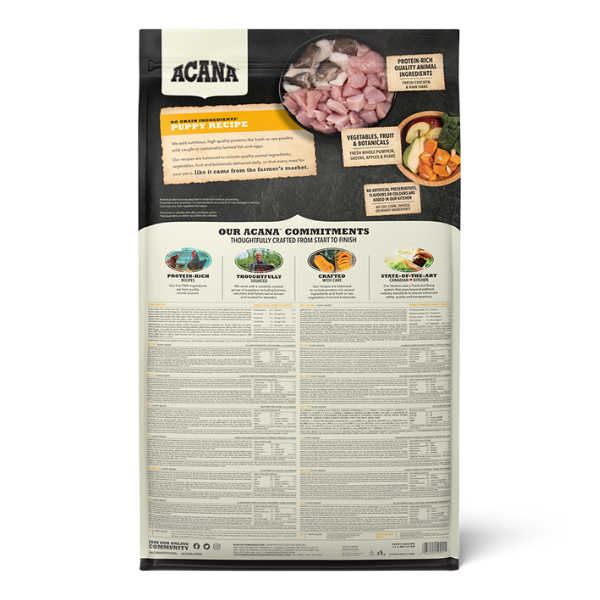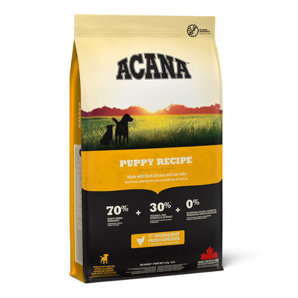 When it comes to ACANA™ food for dogs, we’re obsessed with every ingredient that goes into our premium recipes made in Canada. That’s why our Puppy Recipe is thoughtfully crafted with ingredients that help nurture your medium breed puppy’s growth and development. Made with 70%1 quality animal ingredients like fresh chicken and raw hake balanced with 30%1 fruit and vegetables2 like fresh whole pumpkin, greens, apples and pears, this recipe provides the nutrition and animal protein your puppy needs to live their best life. These wholesome ingredients are provided by suppliers we know and trust, and our vets and pet nutrition experts carefully craft each recipe with the goal of making your pet feel so good inside, you’ll see it on the outside.